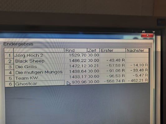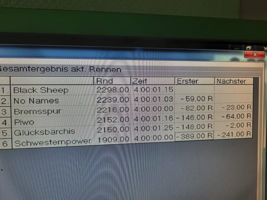 | 4 | Glückbärchies | Andreas Orgelmacher, Sebastian Schory, Sebastian Baehr | 3297,56 | - 247,90 R. | - 122,50 R. |