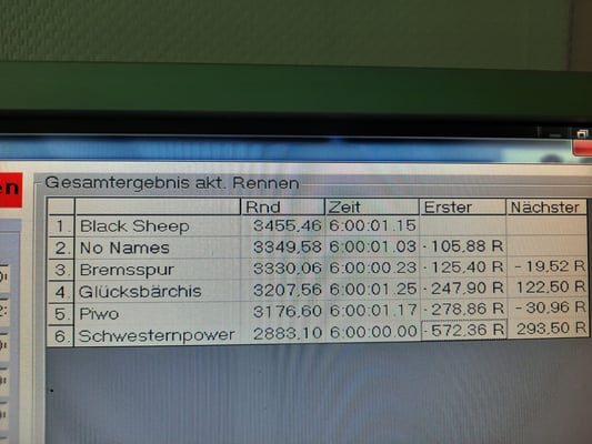 | 6 | Schwesternpower | Michaela Baehr, Nicole Faßbender | 2883,10 | - 572,36 R. | - 293,50 R. |