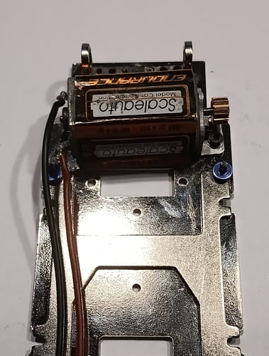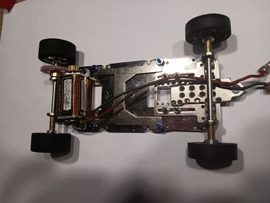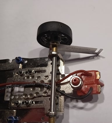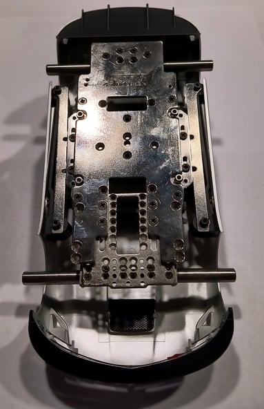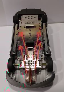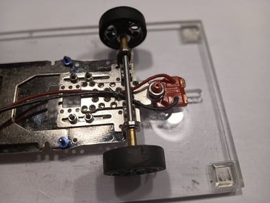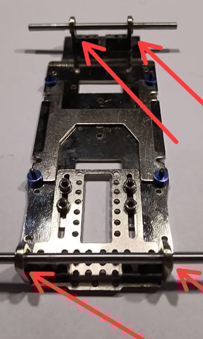 Nach dem Ausrichten wird das Fahrwerk mit den vorhandenen originalen Scaleauto T-Hülsen (wie in unserem Reglement vorgeschrieben) auf dem Chassis verschraubt. Die T-Hülsen ermöglichen die