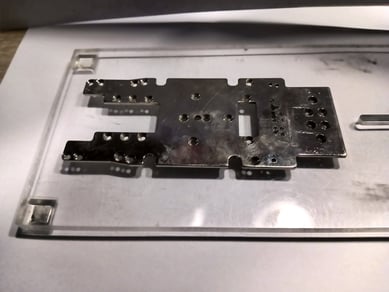 Als Nächstes widmen wir uns dem Fahrwerk-H. Dieses muss ebenfalls sorgfältig ausgerichtet werden, sodass es nach der Bearbeitung vollständig plan auf der Chassis-Grundplatte aufliegt. Eventuelle