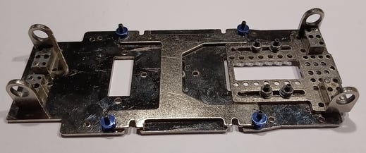 Falls die Chassisplatte verzogen ist, muss an dieser Stelle nachgearbeitet werden. Durch vorsichtiges Biegen an den entsprechenden Stellen lässt sich dies korrigieren. Alle Biegevorgänge sollten mit Bedacht durchgeführt werden, um zu große Krafteinwirkungen zu vermeiden, da dies den Zustand nur verschlechtern würde.
