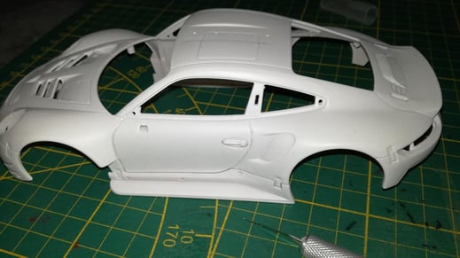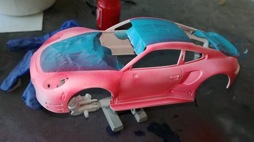 Nach vier dünnen Schichten Grundierung erstrahlt der Porsche nun vollständig in Weiß.