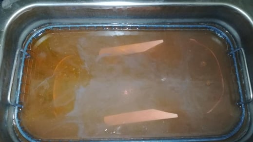 Wir empfehlen die Entlackung mit Isopropanol im Ultraschallbad. Eine Durchführung ohne Ultraschallbad ist ebenfalls möglich, erfordert jedoch deutlich mehr Zeit.