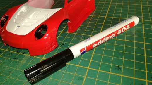 Auch für die Scheinwerferlöcher lässt sich Aqua Color gut mit dem Pinsel auftragen. Lackstifte wie Edding oder Molotowstifte sind ebenfalls in verschiedenen Farben ideal für kleinere Teile.