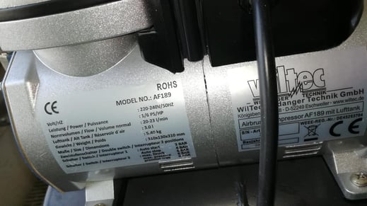 Hier ist ein Bild von meinem Kompressor. Für unser Hobby muss es kein teurer 500€-Kompressor sein. Wichtig ist, dass der Lufttank groß genug ist, damit man nicht ständig warten muss, bis sich der Druck wieder aufgebaut hat.