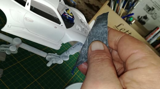Falls die Grundierung in den Fugen zu dick ist, kann man die Fugen vor dem Schleifen vorsichtig mit einem Skalpell oder ähnlichem Werkzeug freikratzen.