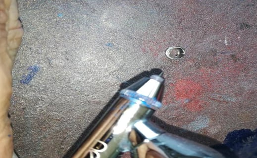 Zuerst immer den Knopf der Pistole NUR nach unten drücken, nur Luft, und dabei vom Wagen weghalten. Falls noch Farbe in der Düse ist, würde das sonst raus spritzen. Dann langsam den Knopf nach